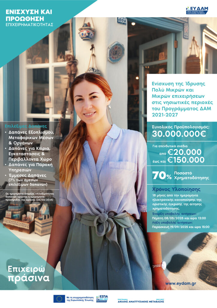 Επιχειρώ Πράσινα» – Επιχορήγηση 70% για Νέες Μικρές Επιχειρήσεις σε Νησιά